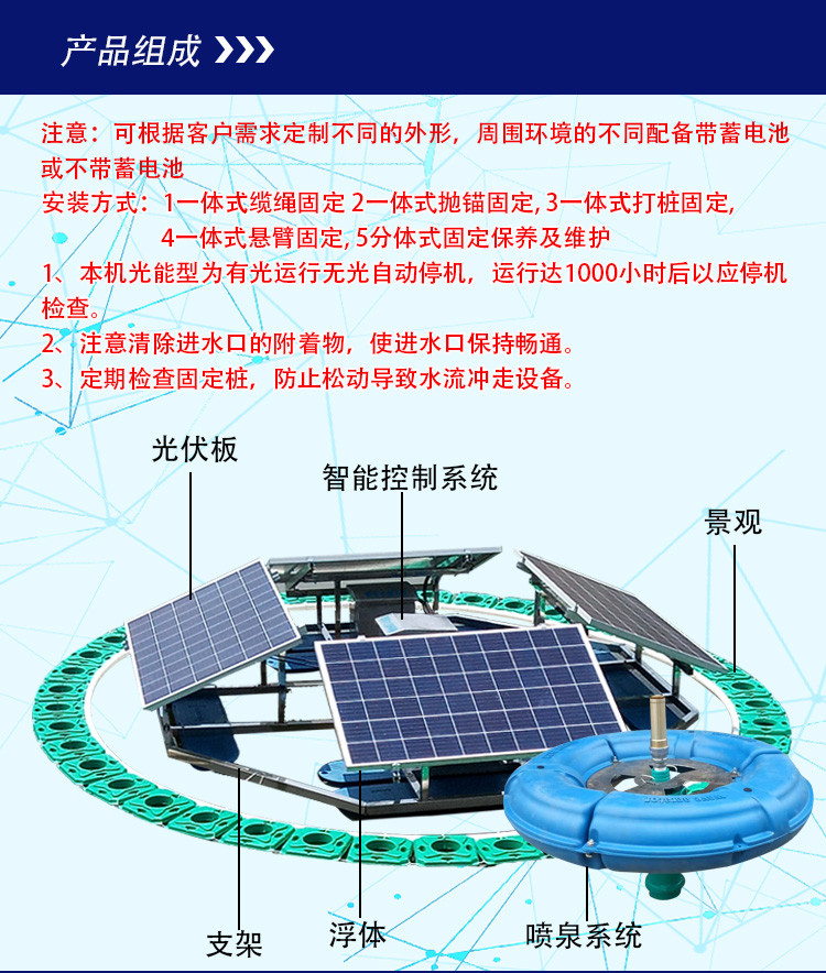 新能源太阳能曝气机 光伏浮船蓄电池组太阳能喷泉曝气机 太阳能光伏喷泉曝气机