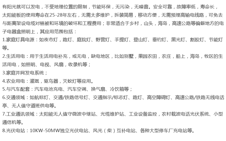 小型太阳能滴胶板广泛应用于儿童玩具,灯饰,小型圣诞礼物,MP3,MP4,道钉,花园灯,庭院灯,太阳能手电筒,太阳能充电器,太阳能POLY工艺品,太阳能DIY玩具,精品教学等上面都能应用。