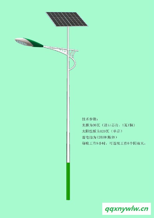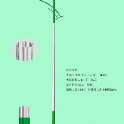 产品特点1.安装简便,不需要铺设复杂的线路,只需要一哦个水泥基座,用螺丝固定即可。2.免电费,太阳能路灯是一次性投入,无维护成本,三年左右收回投资成本,长期收益。3.没有安全隐患,太阳能灯具采用的是低于36V的安全直流电,不会出现安全问题。4.太阳能路灯主要部件——太阳能电池板的使用寿命25年;超亮LED的平均寿命大于5000小时;太阳能专用蓄电池的寿命为5-7年。73.绿色环保,能为高尚生态小区的开发和推广增加新的卖点;可持续降低物业管理成本,减少业主公共分摊部分的费用。产品参数说明防护等级:IP65安装管径:60mm高压压铸铝成型外壳,外部静电喷塑处理高纯铝板压制成型反射器,表面阳极氧化处理.不锈钢搭扣,不锈钢紧固件螺栓.螺母.透光罩采用曲面高强度玻璃,耐高温硅橡胶密封带.灯杆经热镀锌后表面静电涂装,质保15年不生锈。适用高度:5米由于规格、材料等相关数据以用户要求为准,所以具体价格以实时洽谈为准!